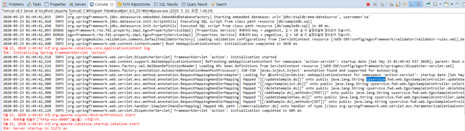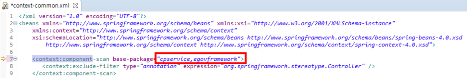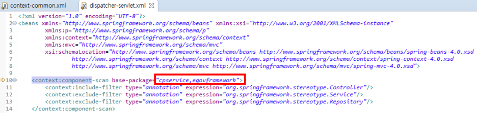 처음 열어보면 base-package가 egovframework만 있을텐데 그 앞에 아까 자기가 정했던 패키지 이름을 추가해주고 쉼표를 찍어준다. 나는 패키지 이름의 맨 앞을 cpservice라고 변경했기때문에 cpservice, 을 삽입했다. 그리고 컨트롤+S를 눌러 저장해준다.