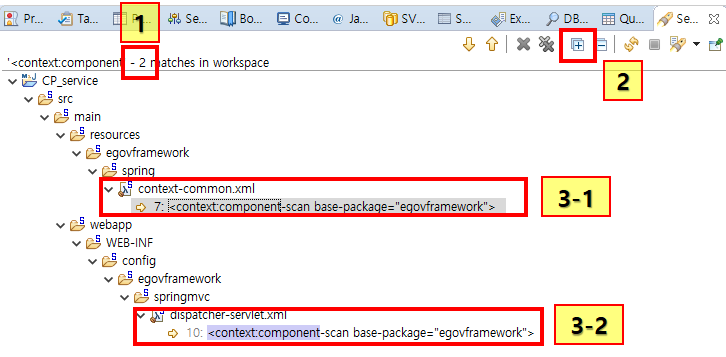 뚜둔! 하단을 보면 검색 결과가 나왔다! 1번 박스를 보니 프로젝트 내에서 모두 2건이 검색됐당!! 2번 박스를 눌러 다 펼쳐보자. 그럼 context-common.xml과 dispatcher-servlet.xml 두파일에서 해당 텍스트가 발견됐다. 두 파일 모두 바꿔줘야하는데 먼저 3-1을 더블 클릭 해보자.