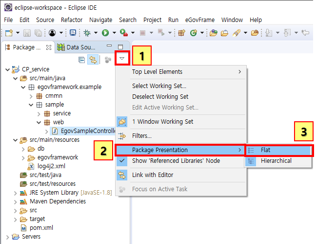 자 먼저 패키지 익스플로어에서 1번 화살표를누르고 2번 package Presentation 버튼을 눌러준다. 나는 보통 하이어라키 타입을 쓰는데 디렉토리 수정을 위해서 Flat으로 바꿔주자!