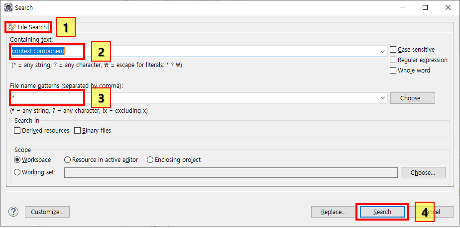 자 컨트롤키와 H를 눌러보자. 위 창이 뜨는데 1번에 파일 서치 탭에 들어가보자. 아마 처음 하시는 분들은 여러가지 탭이 뜰텐데 나는 나머지 탭은 많이 안써서 다 꺼놓은 상태이다. 아무튼 File Search탭에 들어가고 2번에는 검색할 스트링을 입력하는 공간이다. 그리고 3번은 확장자인데 *이 입력되어있으면 전체라는 뜻이다. 머 화면단에서만 찾고싶으면 *.js, *.jsp, *.html 등으로 검색하는 확장자를 제한할 수 있다. 우린 소스 규모가 크지 않으니 걍 *로 둬도된다. 나중에 검색 시간이 너무오래걸리면 줄여주도록하고, 마지막 4번을 누르면 검색된당. 검색해보자!