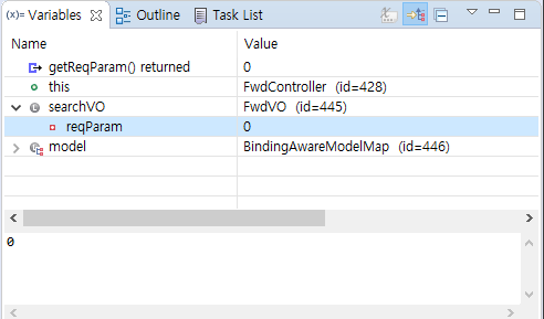 그럼 이렇게 현재 값들을 볼 수 이쓴ㄴ Variables 탭이 추가된다. 이제 코드를 한줄한줄 돌리면서 값들이 바뀌면 실시간으로 저 Variable들이 변화를 하게 된다. 위 사진처럼 searchVO를 펼쳐보면 reqParam이 보이게되고, 변수를 담아서 보내지 않으면 0을 보내주는 것을 알 수 있다.