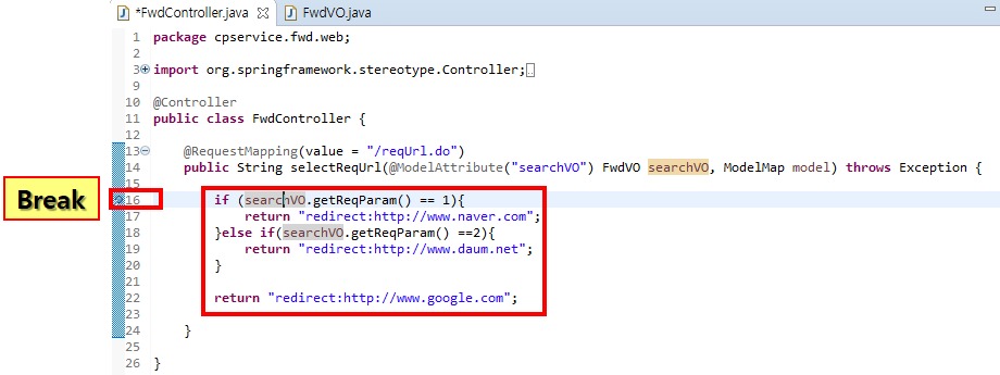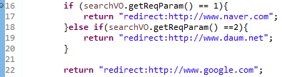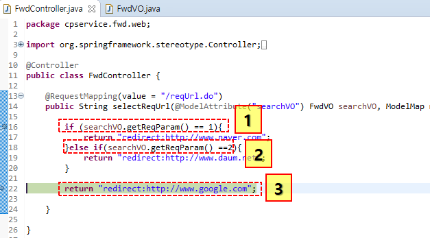 이정도 코드로 보면된다. 여기서 물어볼만한건, searchVO에서 값을 쓰고, 꺼내오는건 저번 시간에 VO를 선언할때 안에 같이 따라오는 get, set 함수를 지정했기 떄문에 이걸로 꺼내오느라고 searchVO.getReqParam() 함수를 사용하는 것이고 22번줄에 구글로 포워딩시켜주는 return을 넣어놓은 이유는 사용자가 요청을 줄때 꼭 reqParam을 안넘겨 줄 수도 있고, 혹은 넘겨준다 하더라고 1이나 2가 아닌 999를 넘겨줄 때는 처리할 로직이 없기때문에 그 아무것도 아닌경우는 구글롤 넘겨주겠다~ 해주는 로직이다.