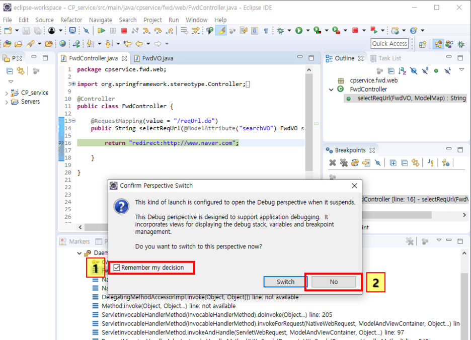 자 이클립스로 돌아와보면 이런 화면이 떠있을텐데, 중단점을 인식했고, 디버그가 걸렸으니, Perspective를 debug관점으로 바꿀꺼냐는 것인데, 뭐 우린 Debug 관점의 고급기능을 이용할 일은 없으니 1번을 체크해주고 2번을 눌러 관점을 바꾸지 않겠다고 하고 진행한다.
