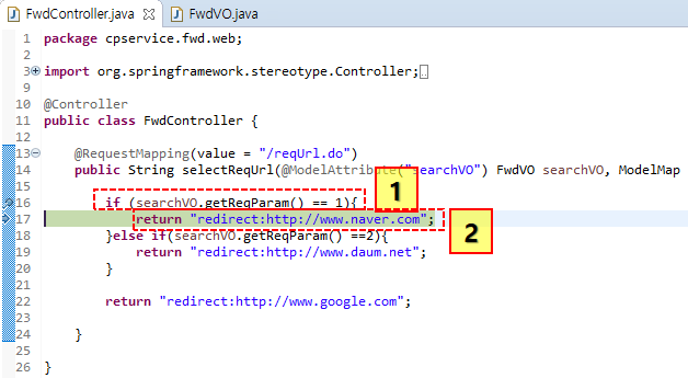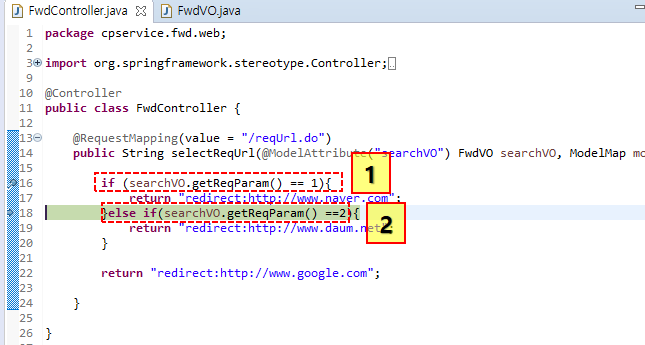 자 그럼 우리가 사용자가 reqParam에 1을 담아서 주면 네이버로 연결시켜주고, 2를 담아서 주면 다음에 연결시켜주는 소스를 작성해보자.