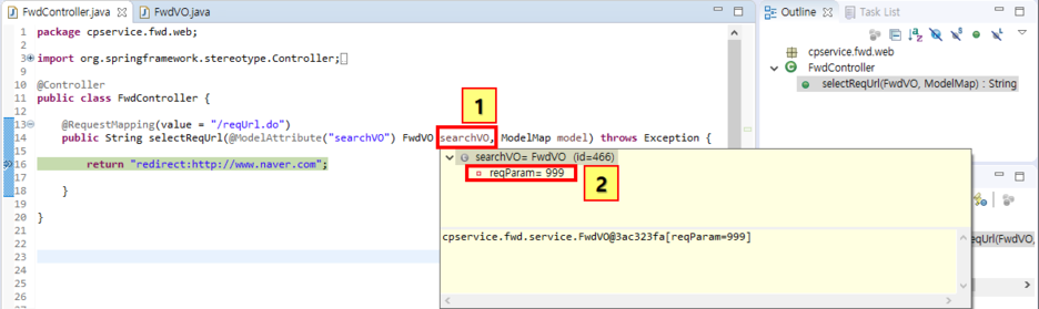 자 1번 위치에 마우스를 올려 한 1초정도를 기다리면 노란색 박스가 뜨는데 거기 보면 지금 FwdVO형태로 이름이 맞는것끼리 자동으로 매핑된 reqParam이 들어온 것을 볼 수 있다. 값도 보면 999로 들어온 것을 볼 수 있다.