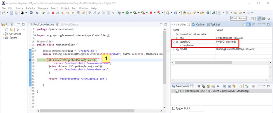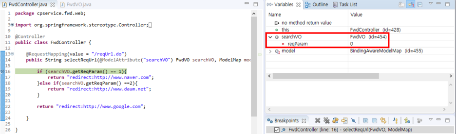 자 reqParam에 1이 들어왔으니 당연히 if문 내부로 통과할 것이고 커서가 2번 박스로 들어올꺼다. 여기서 F8을 눌러 진행하면 naver로 포워딩이 되고, 다시 reqParam을 2로 요청하고 다시 디버그 결과를 보면 daum으로 포워딩 되는 것을 볼 수 있다!