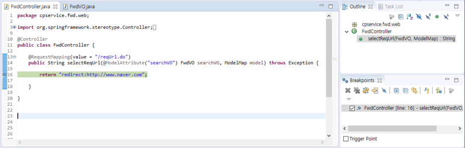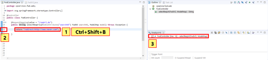 자 우리가 만든파일 16번 줄에 있는 return "redirect:http://www.naver.com";줄에 마우스를 눌러 입력커서를 저 위치로 이동시키고 Ctrl+Shift+B 단축키를 눌러보자! (1번 박스) 그럼 2번 박스위치에 파란색 점이 하나 찍힐 것이고 3번 박스인 Breakpoints 박스에 해당 중단점이 하나 추가될 것이다! (Brekapoints 박스가 하단에 있을테지만 난 우측이 편해서 우측으로 옮겼당 ㅎㅎ)