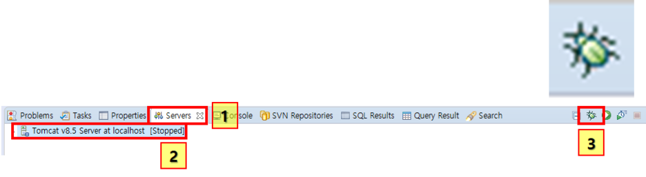 자 우리가 원래 서버를 실행시킬때 보통 재생버튼을 눌러 실행해 보았으나, 이번에는 서버탭(1)을 클릭하고 원하는 서버를 클릭한뒤(2) 벌레모양의 버튼(3)을 눌러보자! 이쯤되면 이제 저 버튼이 왜 벌레오먕인지도 알 것이다. 저 버튼은 Debug 버튼인거다! 벌레잡는 버튼! = 버그 잡는 버튼!!