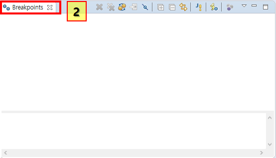 그럼 화면 우측 하단 구석에 저런 화면이 뜰텐데 우린 Breakpoint를 열어줄꺼니 "B"버튼을 한번 더 눌러주자! 그럼 2번 화면처럼 Breakpoints 탭이 생긴 것을 볼 수 있다. 이 창이 바로 BreakPoints 를 관리하는 화면이다. 사실 단축키 말고 마우스로도 설정에 들어가 이탭을 불러 올 수는 있는데, 너무 과정이 많아서 그냥 단축키를 외우도록하자! "Alt + Shift + Q" + "B"!!