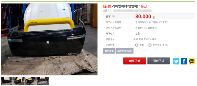 6~7만원대 범퍼도 있었으나, 가장 상태가 좋은 8만원짜리 범퍼를 구매했다. 문제는, 수령방법인데.. 착불로 받자니.. 저 큰 제품을 받으면 착불비도 만만치 않을테고.. 마침, 업체에 전화해보니, 저 부품은 일산 인선모터스에 위치해 있다고 한다! 집에서 15분거리니 방문수령을 선택했다.