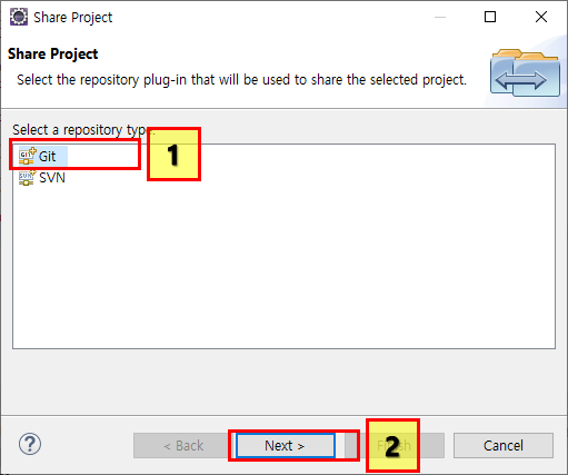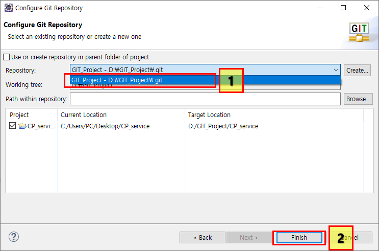 저장소가 처음에 비어져있는데(1번 위에박스) 그거 누르면 아래에 내가 추가했던 git 저장소가 나온다 클릭해주고 Finish를 눌러주자!