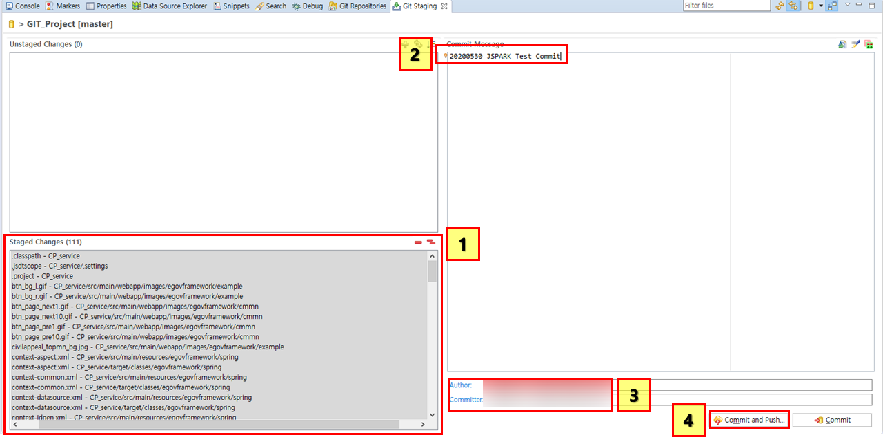 3번은 작성자와 배포자인데 누가 한건지 설명을 써주는 부분이다. 마지막으로 4번을 보면 그 옆에 Commit이 있고 Commit and Push가 있는데 차이점을 알아보자.