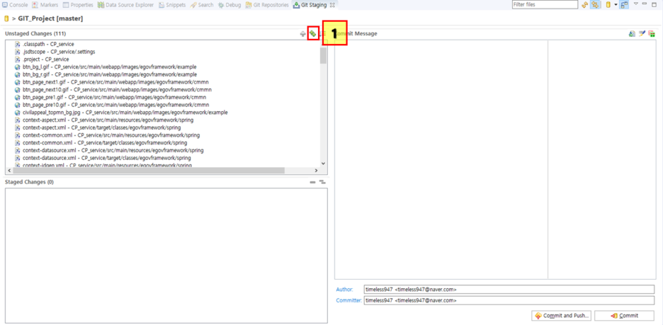 어떤 파일들을 올릴꺼냐고 뜨는데 첫 Commit이니 전체파일을 올려줄꺼다. 저 1번 박스에있는 +가 겹친 아이콘을 눌러주자!