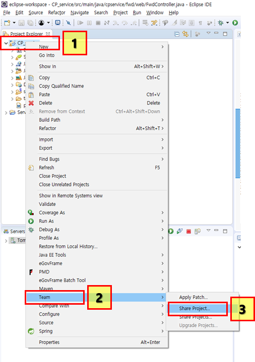 자 깃허브로 올릴 프로젝트를 오른쪽마우스 누르고 Team 메뉴로가 Share Project.. 버튼을 눌러주자!