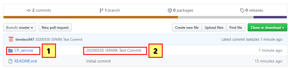 그럼 파일들이 1번으로 넘어오게 된다. 2번을 보면 이 commit하는 소스들이 어떤 기능을 하기 위해 commit하는지 주석처럼 자유롭게 서술하는 부분이다. 나는 걍 첫 commit이니 할말 없어서 Test라고 적었다. 그리고 저기 날짜와 작성자를 같이 써놓으면 나중에 찾기 편하다.