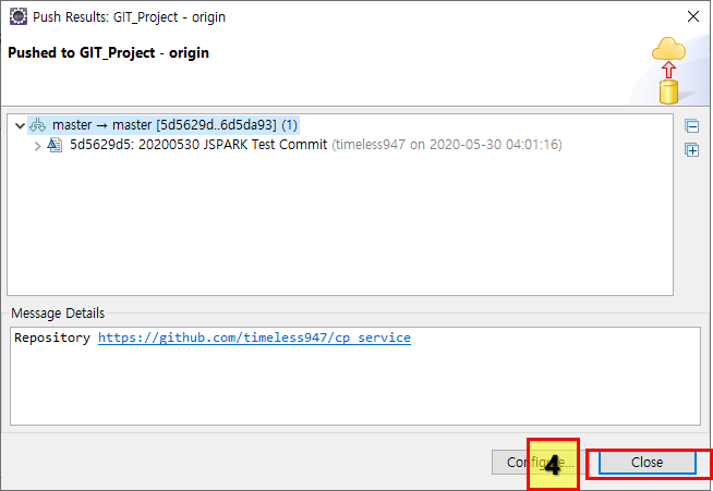 즉 Commit and Push는 로컬에도 반영하고 그걸 원격에도 반영하겠다는 All in 1 버튼인거다. 우린 서버까지 올릴꺼기 때문에 4번 버튼을 눌러주자!