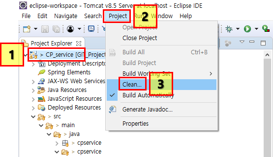 자 Clean 하려는 프로젝트를 선택하고(1) 상단에 Project(2) 메뉴를 누른 뒤 Clean(3) 버튼을 눌러주자