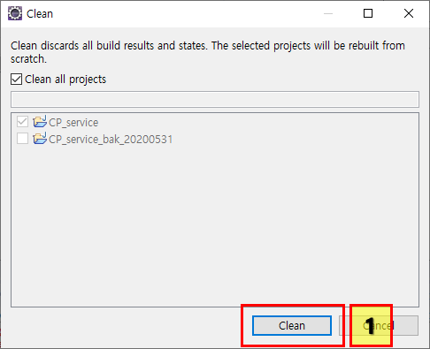2. 프로젝트 Clean (완전 새로 빌드)