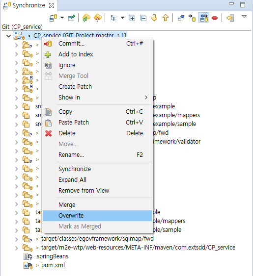 좌측 Synchronize 탭에서 프로젝트명을 오른쪽마우스 클릭해주고 Overwrite를 눌러주자.