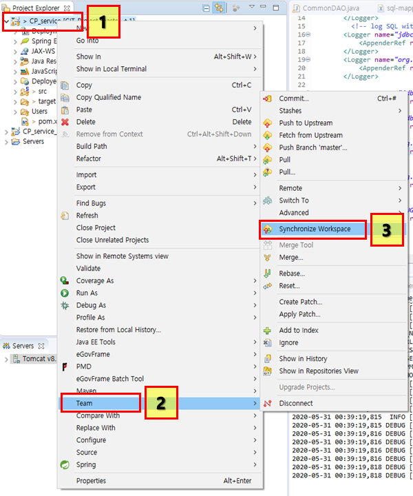자 복원하려는 프로젝트를 오른쪽마우스 클릭해주고 Team 메뉴에 들어가주자, 그리고 Synchronize workspace 버튼을 눌러주자