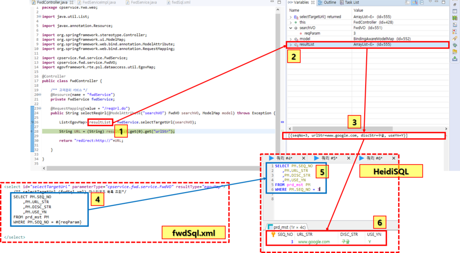 우리가 fwdSql.xml 에 쿼리를 작성해놨고 이 4번박스에 있는 쿼리가 실제로 실행된 것이다. #{reqParam}에는 VO에 들어있던 3이 들어갔을꺼고 실제로 DB에서 조회하는 쿼리는 5번과 같이 작성됐을 것이다. 이걸 HeidiSQL에서 실제로 돌려보면 6번과 같은 결과가 조회된다.
