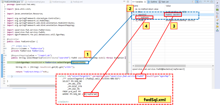 우측 Variable탭의 2번 박스를 보면 현재 searchVO라는 객체에 어떤 값들이 할당되어있는지 보인다. 펼쳐서 보면 reqParam에 3이라는 값을 정상적으로 mapping 해서 가져온걸 볼 수 있다. 이건 ,http://localhost:8080/reqUrl.do?reqParam=3이걸 실행할 때 reqParam=3 이란걸 보고 FwdVO안에 있는 reqParam이라는 변수와 이름을 매칭시켜 가지고 온것이다.