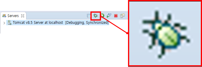 자 우리가 디버깅을 하려면, 서버도 Debug모드로 켜져있어야 들여다 볼 수 있다. 디버그 모드로 실행하기 위해 서버를 클릭하고 Run(재생버튼)이 아닌 옆에 벌레모양의 Debug 버튼을 눌러서 실행해주자!