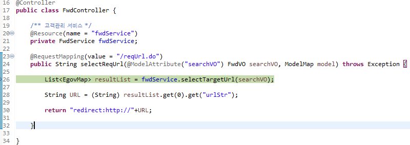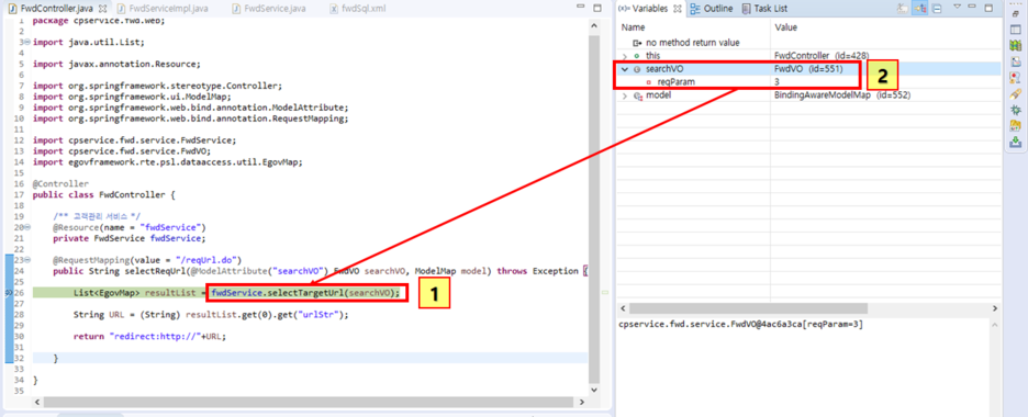 자 우리가 reqUrl.do를 처리할때 1번 박스를 보면 들어오는 데이터를 FwdVO객체에 맵핑해서 가져오는 걸로 되어있다. 그럼 저 26번째줄이 실행되기 직전 값이 제대로 들어왔는지 볼까?