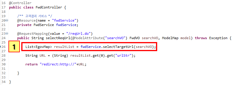 자 그럼 다시 중단점이 걸린 26번째 줄을 다시보면 저기 selectTargetUrl()함수가실행되는데 보면 함수안에 저 searchVO 객체를 넣어주는 것을 볼 수 있다. 즉 아까 위에서 봤던 reqParam이 3으로 셋팅된 searchVO객체를 쿼리돌리는 함수에 변수로 넣어준다는 거다.