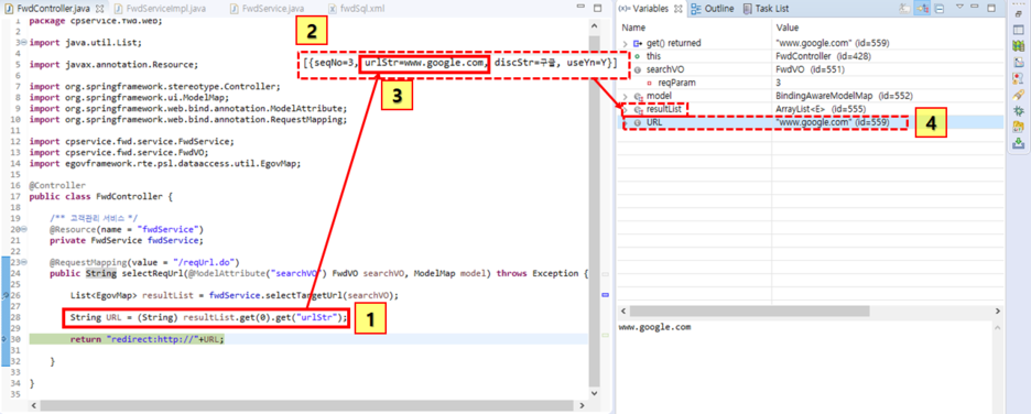 그럼 저 3번 박스에 있는 Key에 해당하는 Value인 www.google.com을 가지고 오게 되는것이고 이 데이터가 1번 박스에 (String)형으로 형변환뒤 URL이라는 변수에 담기는 것이다. 4번박스를 보면 URL이라는 변수에 정상적으로 DB에서 조회한 www.google.com이 담긴 것을 볼 수 있다. 이제 마저 30번째줄인 return구문이후로 쭉 수행시키도록하기위해 F8 버튼을 눌러주자.