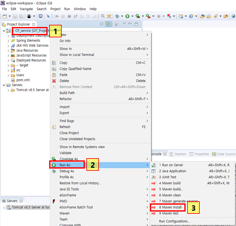 자 일단 처음부터 깔끔하게 시작하기 위해 Maven Clean과정을 통해 깔끔하게 없애주자. 본인 프로젝트 오른쪽마우스(1)를 누른뒤 Run As를 누르고(2) Maven clean을 눌러주자(3)
