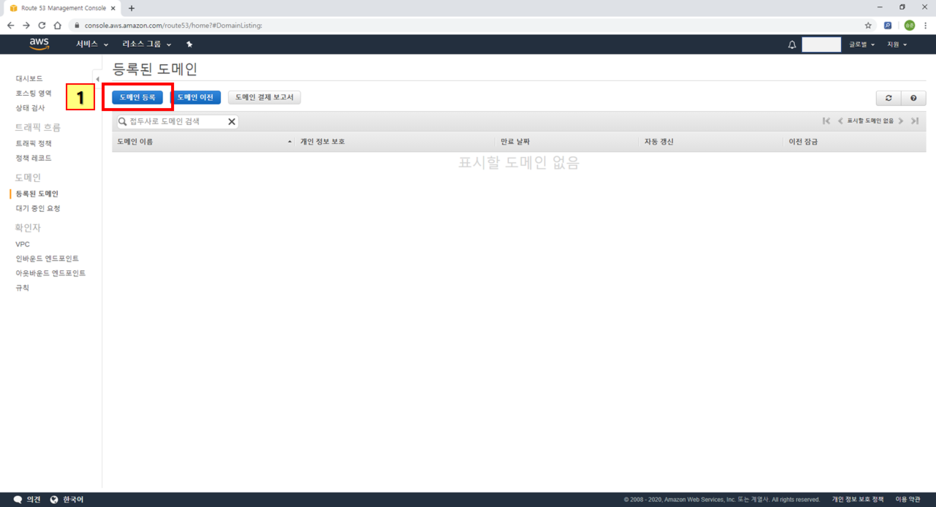 일단 가비아나 머 이런데서 살 수도 있는데 AWS에서 서비스하고 있는 Route 53에서 도메인을 구매해보자 가격차이는 크게 안난다. 머 1년에 1.4만원정도? 업체별로 천원, 이천원 차이인데 편한곳에서 구매하면 된다.