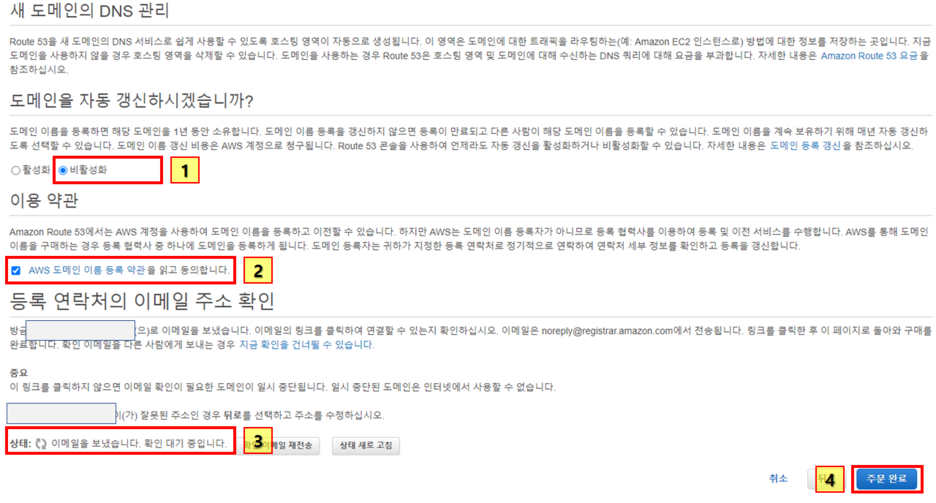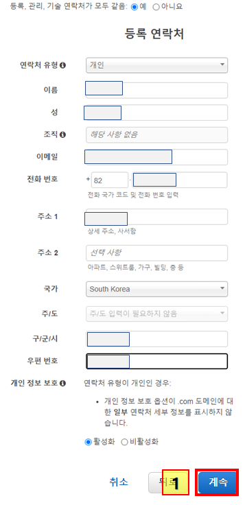차근차근 해보자 먼자 1번 박스 개중요하다. 이거 1년뒤에 자동결제 할꺼냐는건데 우리같은 취미로 하는분들은 비활성화를 해놓자.. 안그럼 1년뒤에 자동으로 결제된다. 혹시 꼭 이 도메인을 절대 빼앗기고 싶지 않은분은 뭐 자동연장이 좋겠지만.....1년뒤에 이거 결제해논게 기억이나 날까..? ㅠㅠ