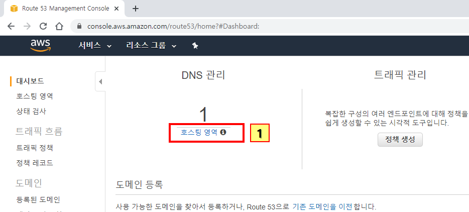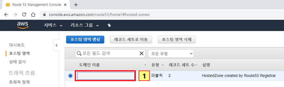그다음 호스팅 영역으로 이동! 숫자가 1이 카운트 된걸 볼 수 있다.
