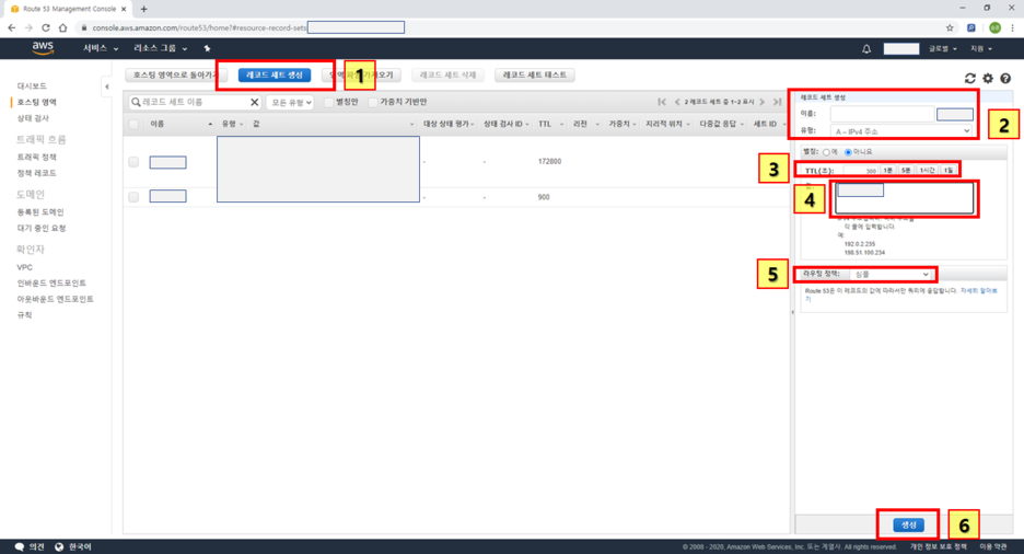 2번 박스는 서브도메인이 있는경우에 설정하고, 없는사람은 두면된다. 보통은 없기에 걍 비워두면 된다. 그 밑에 유형은 주소체계인데 IPv4를 사용할꺼니 그냥 두자. 3번 박스는 캐싱시간인데 그냥 디폴트로 두자.. 가장중요한게 4번이다. 바로 연결하려는 자기 AWS EC2 인스턴스의 IP주소를 저기다 넣으면 된다. 5번은 라우팅 방식인데 심플한게 젤 좋으니 그냥 두자 ㅎㅎ 마지막으로 생성 버튼을 누르자!