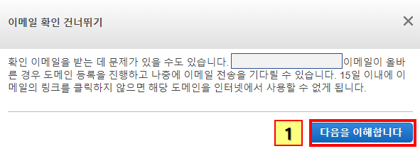 다음으로 넘어가면 이런 팝업이 나온다. 뭐 한마디로 이메일주소 구라면 죽는다란 뜻이다. 제대로 입력했는지 다시 한번 확인해보고 넘어가자! 15일 뒤까지 이메일로 인증안하면 취소된단 얘기다.