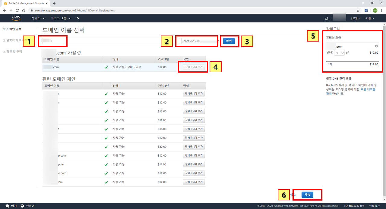 자 1번 박스에 자신이 구매하려는 도메인을 입력하자. 예를 들면 naver 같은걸루, 2번 박스는 최상위 도메인을 뭘로 할지 고르란건데 나는 당연히 가장 무난한 .com을 택했다. 그뒤 3번 박스의 확인 버튼을 누르면 가능한지 여부가 나오고 그 밑에는 유사한 것 들도 나온다. 지체 없이 장바구니에 추가해주자(4), 그리고 5번 박스를 보며 소계가 나온다. 1년에 12달러! 마지막으로 6번 박스의 계속을 눌러주자!