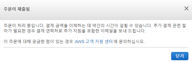 짜잔! 주문성공! 결제 프로세스가 없는걸 보니 이미 EC2 인스턴스 만들때 등록했던 카드로 승인이 따지는 형태인거 같다.
