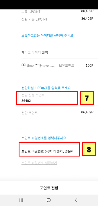 8. 포인트 비밀번호를 누르고 포인트 전환 버튼을 누르자.