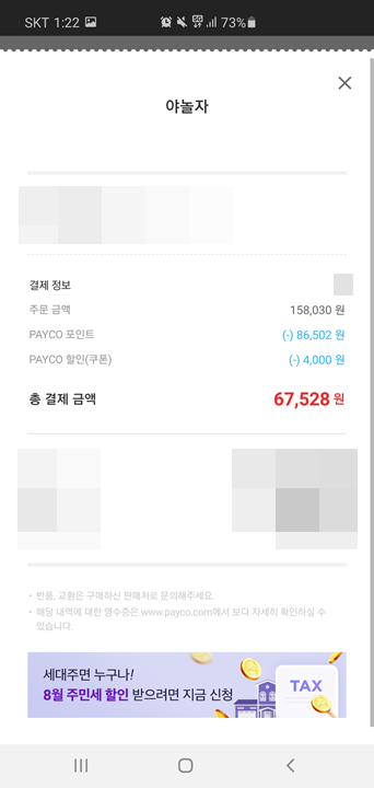 4. 자 보면 최종결제 금액이 158,000원에서 포인트 86,500원이 차감 된 것을 폴 수 있다.