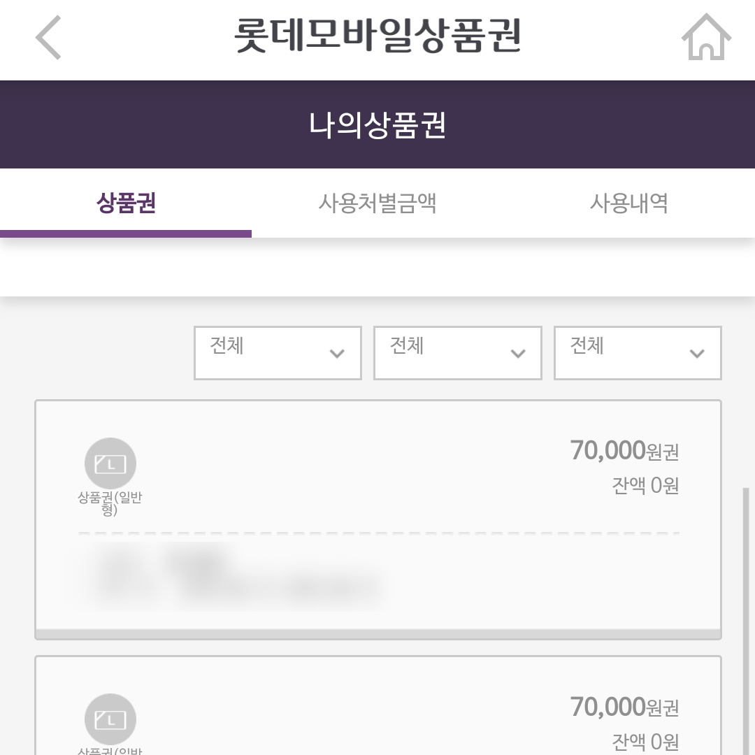 1. 앱스토어에서 "롯데상품권" 이라는 앱을 다운받아 실행한다. 그리고 본인 계정을 로그인하면 본인 상품권들이