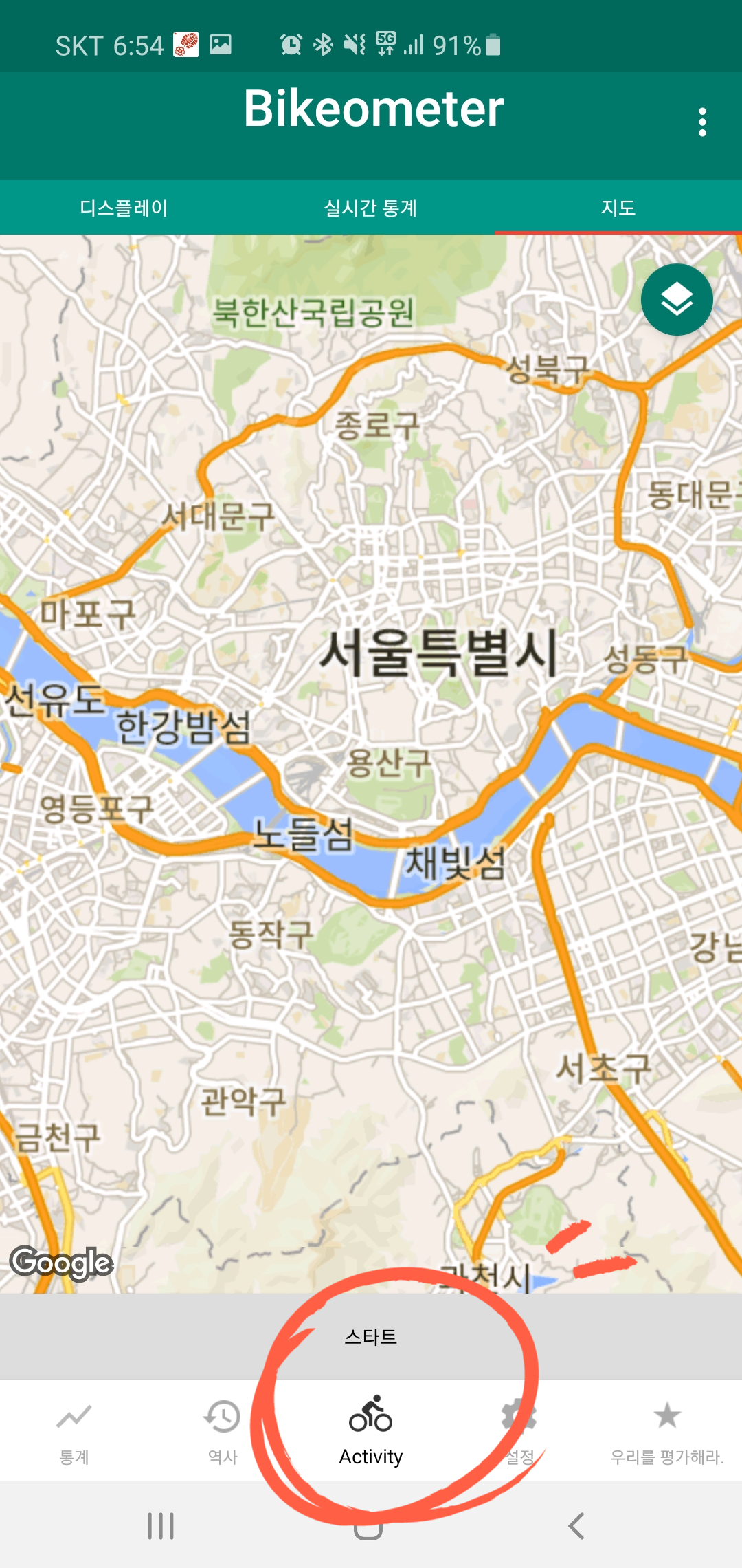 앱 이름이 Bikeometer 이다, 설치할땐 이 이름인데 구글 스토에서는 "자전거 컴퓨터"라는.. ㅡㅡ 이상한 이름으로 뜬다. 처음앤 트랭글인가? 가장 유명한 어플이길래 받았다. 그런데 첫 화면 키자마자 뭐...SNS 연동 로그인 창이랑.. 뭐 회원가입을 해야 쓸 수 있는..뭐 그런화면.. 바로 삭제했다. 그리고 다음타자로 Bikeometer 앱을 받아 실행해봤다. 역시 한국사람은 성질이 급해서 회원가입 이런거 나오면 화난다.
