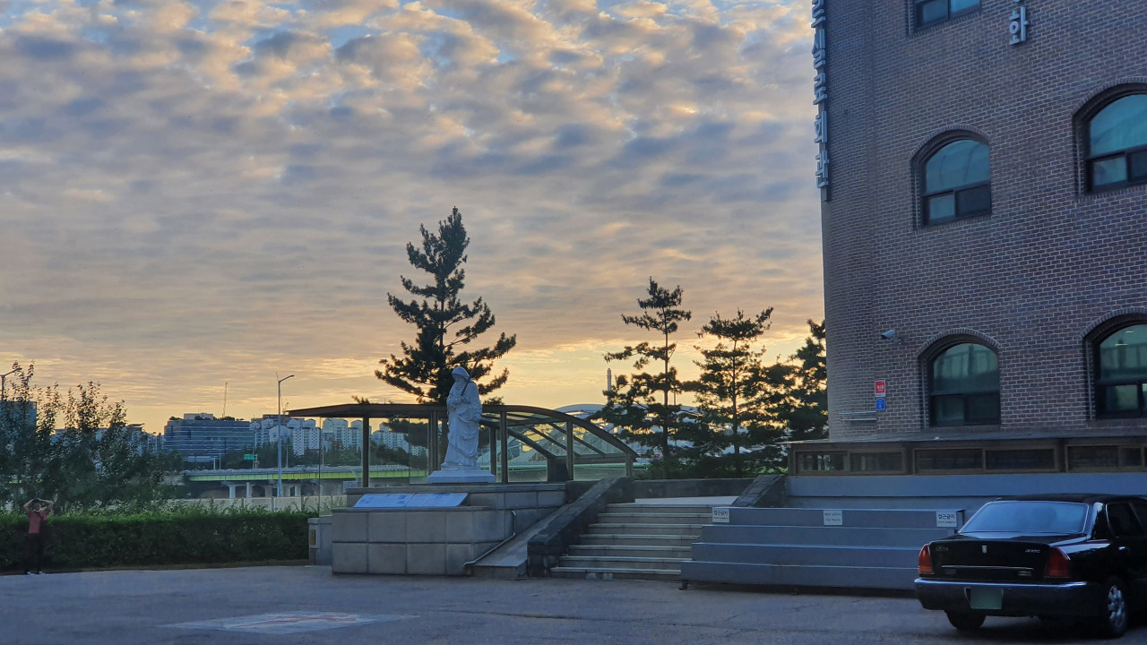 첫 관문, 절두산천주교 순교성지를 지났다. 석고상 뒤로 구름이 인상적이다.