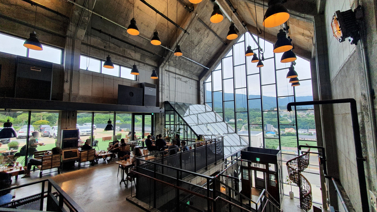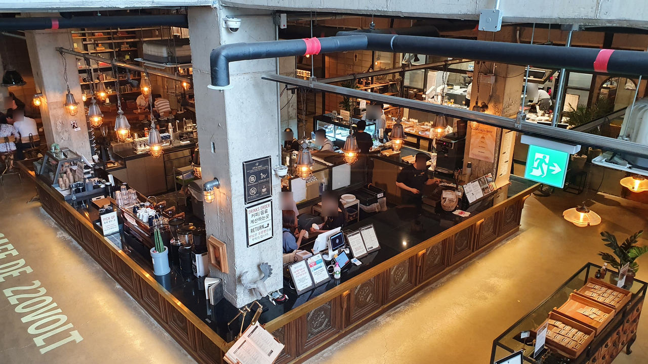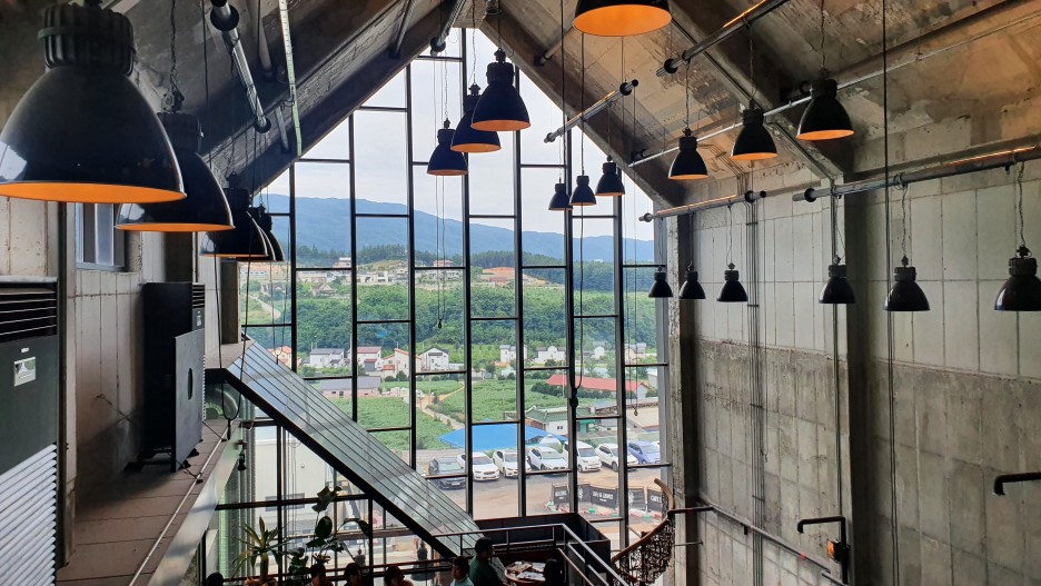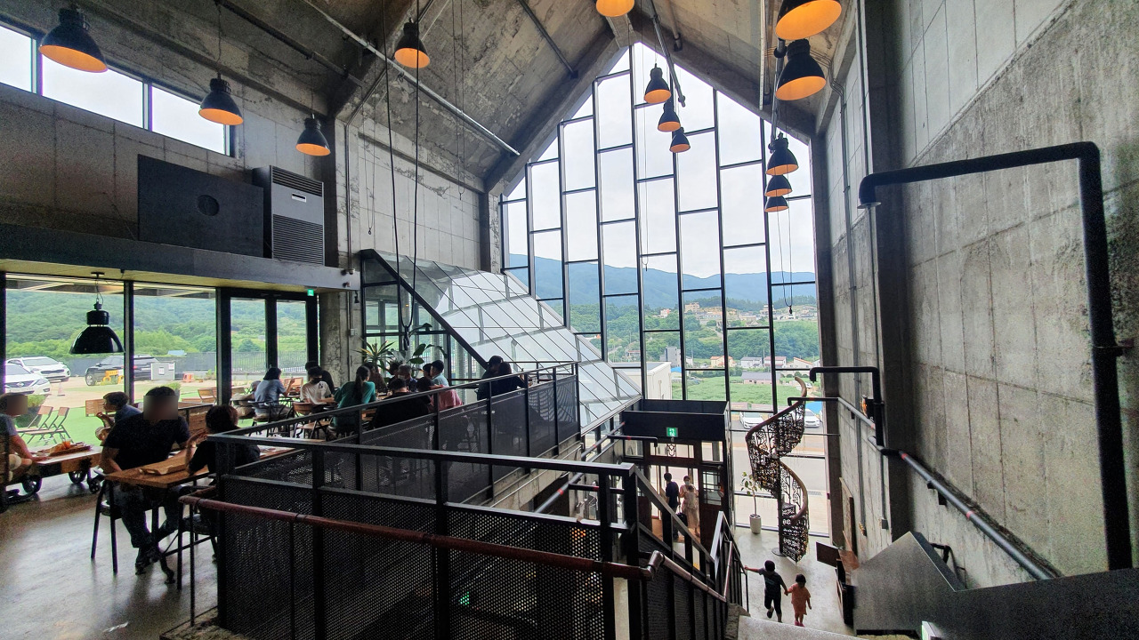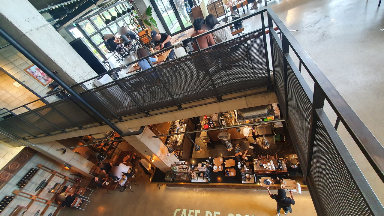 요기가 2층, 층고가 아주 높고 통창으로 뚫려있어서 콘크리트 건물이지만, 답답한 느낌은 없었던거 같다.