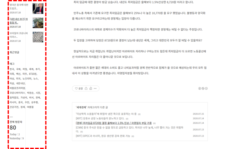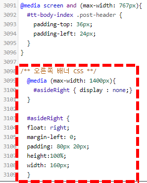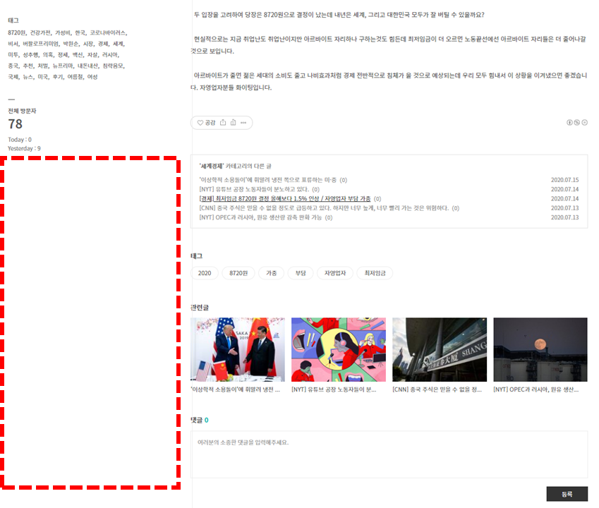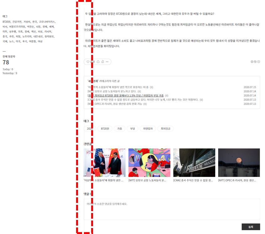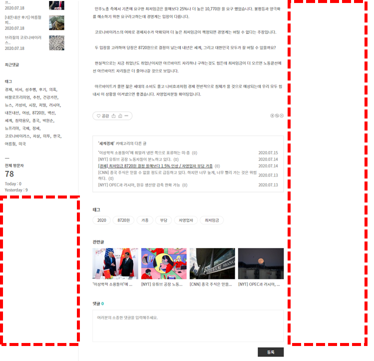 처음에 비해 사이드 영역이 아주 넓어진것을 확인할 수 있다. 이제 저걸 조금 줄여서 우측에 광고를 넣을 자리를 만들꺼다.