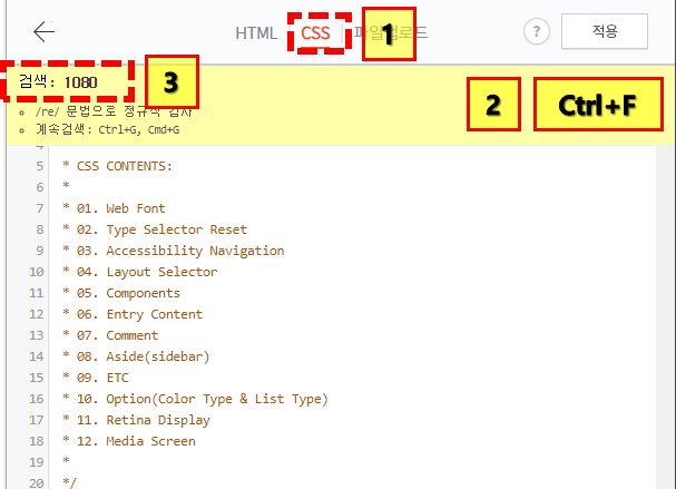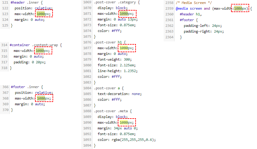 바꿔야할 부분은 저렇게 7군데다.(순정 스킨기준) 저 옆에 줄번호는 CSS 수정유무에 따라서 차이가 날 수 있다. 검색은 그냥 컨트롤+F눌러서 계속 검색하면 된다. 저 1080을 모두 1400px로 바꿔주자!