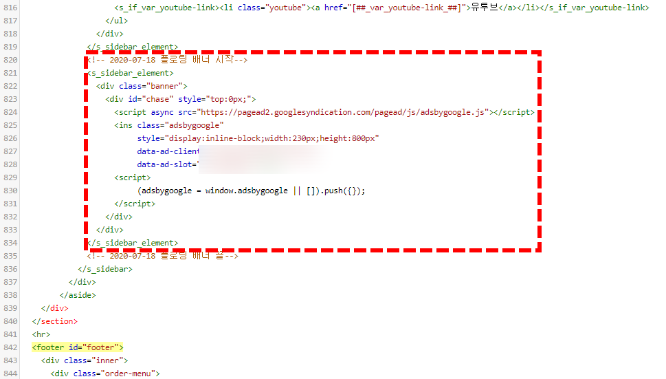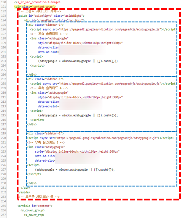 이런식으로 복붙한다. 만약 길게 배너 하나만 붙일꺼면 광고 1 div 태그만 사용하고 나머지 광고2, 광고3 div 뭉텅이는 지우면된다. 나는 길쭉한 배터는 좌측에 있음으로, 작은 배너 여러개를 노출시킬 것이다.