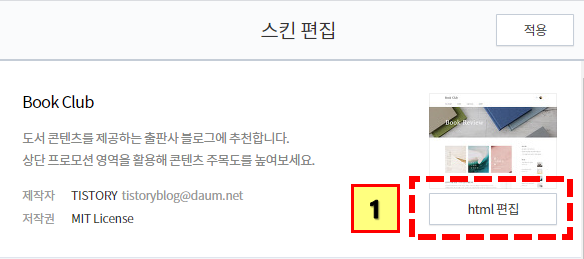 자 먼저 관리자 페이지에서서 꾸미기 -> 스킨편집에 들어와서 1번 박스에 있는 html 편집을 눌러주자.