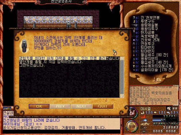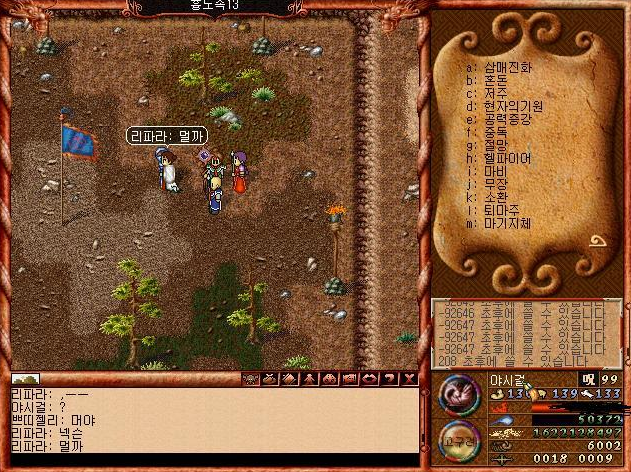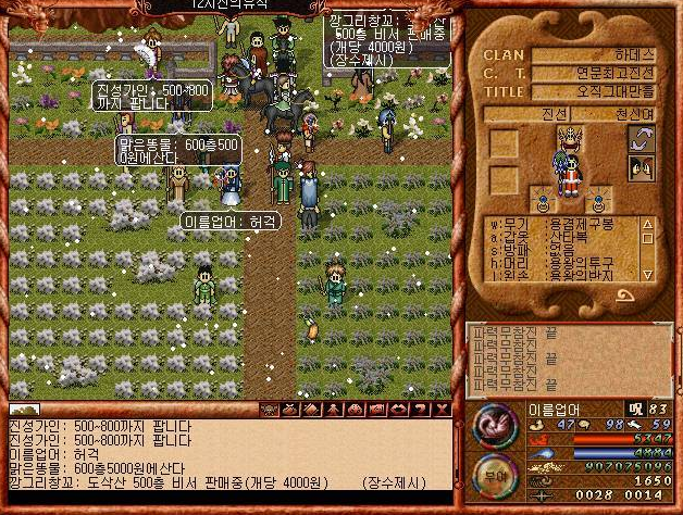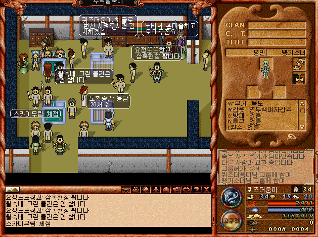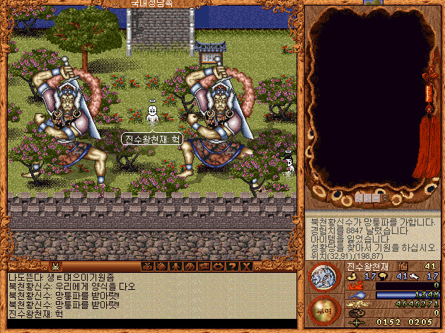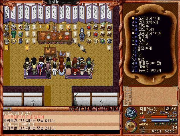 심지어 '감사합니다'라고 말하면 부활후 50밖에 안되는 체력, 마력을 모두 회복시켜준다 ㅋㅋ 성황당 주변에는 진짜 무당이 사는것 처럼 꾸며놨다 ㅋㅋㅋ.. 아직 MMORPG에대한 시스템 정립이 없던 시절.. ㅋㅋㅋ 지금 생각해보면 아주 신선한 시스템이었던 것 같다.