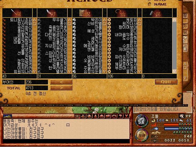 바람은 특이한게 서버에 접속하면 해당 서버에 접속한 모든 사람들을 직업별로 나타내준다. ㅋㅋ 그리고 정렬이 레벨과 체력이 많은순으로 정렬되는데 그래서 랭커들이 들어왔는지 안들어왔는지 찾기 쉬웠다. ㅋㅋ